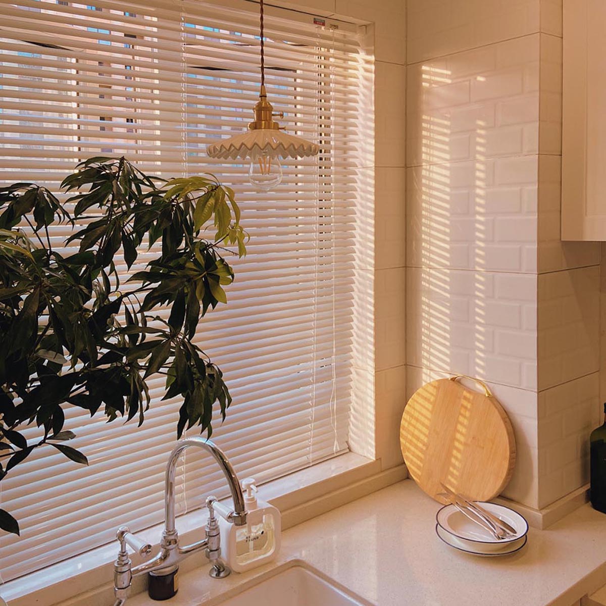Aluminum Venetian blinds are the most common and affordable option, and for good reason—they’re durable, easy to clean, and hold up well in high-traffic areas. I have aluminum blinds in my kitchen, and they’ve been going strong for 6 years now (even with my kids pulling on the cords occasionally).