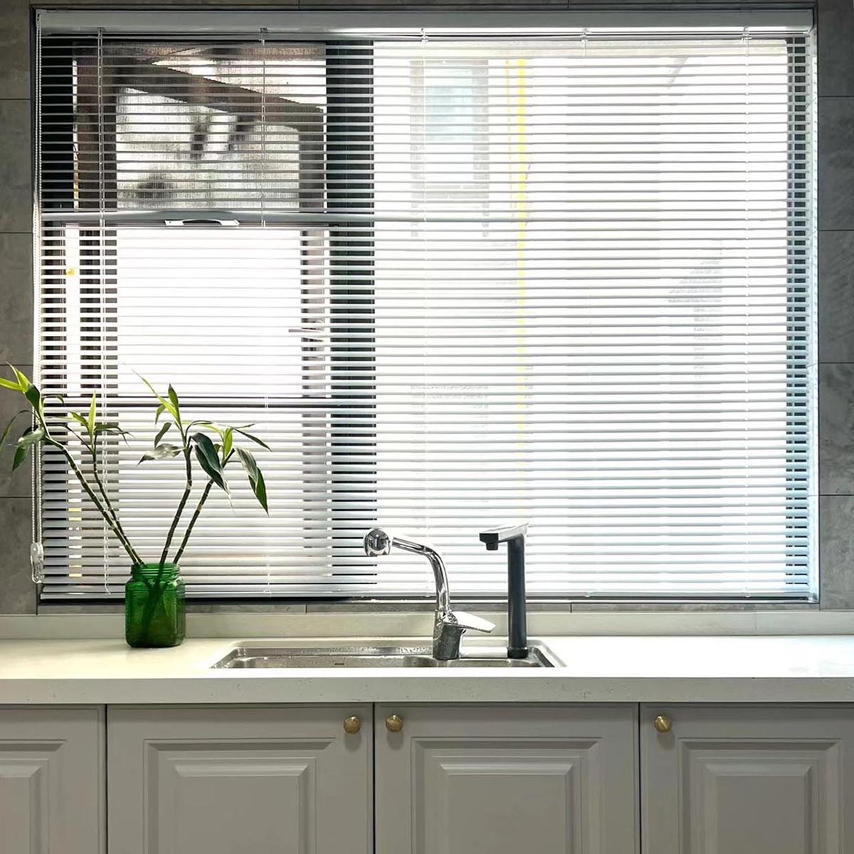 • Vinyl Mini Venetian Blinds: Budget-friendly and so easy to take care of. If you’re decorating on a tight budget, these are a solid choice. They come in tons of colors—from bright whites to soft neutrals—so you can either brighten up a small space or let them blend in with your walls. I used vinyl ones in my kitchen cabinet window, and they wipe clean with a damp cloth (perfect for dealing with cooking grease!).